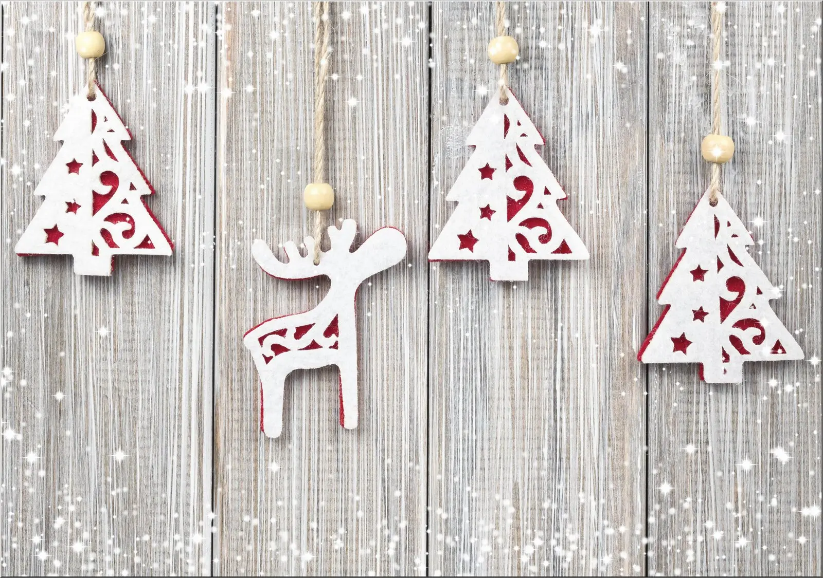 Schicke Weihnachtskarte mit Motiv: Weihnachtliche Anhänger an Holzwand.Vier weiß-rote Anhänger mit einem Renteir und drei Weihnachtsbäumenzieren diese schöne Postkarte zu Weihnachten.Versenden Sie Weihnachtsgrüße an Freunde und Familie.Diese DIN A6 Motiv Postkarte drucken wir exklusiv auf einem350gr Postkartenkarton. Die Rückseite ist mit jedem Stiftgut zu beschreiben.