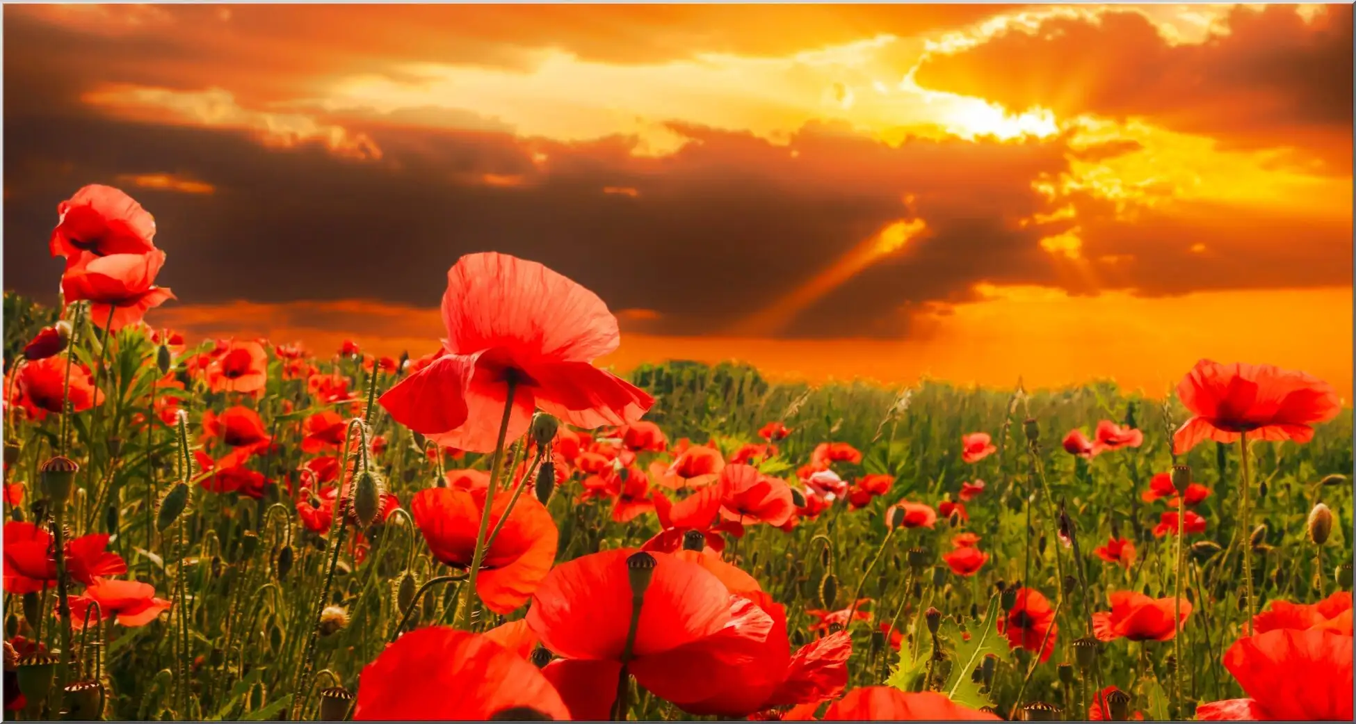 Schöne XXL-Postkarte mit Mohnblumen im Sonnenaufgang