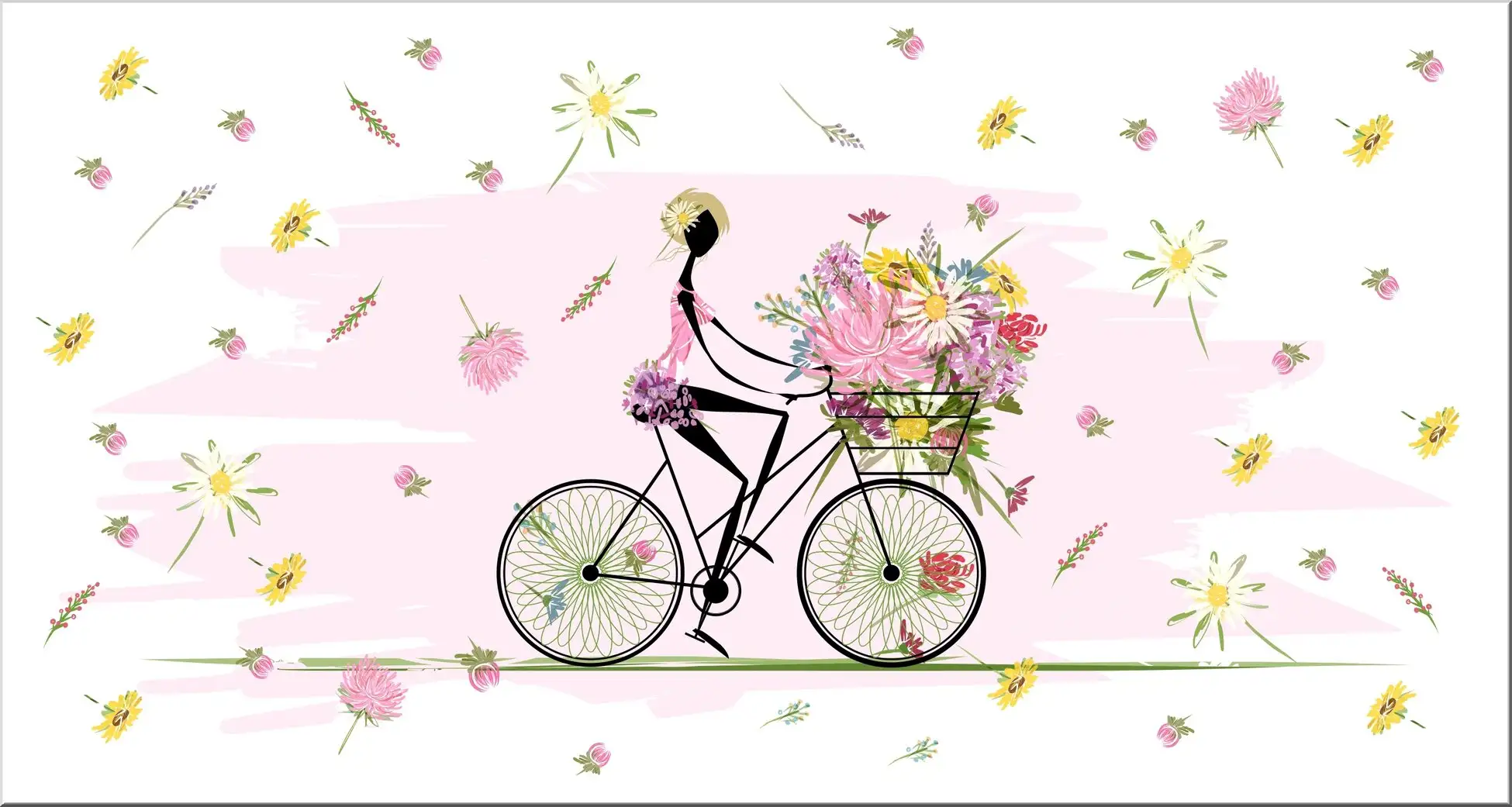 Blumenmädchen auf Fahrrad Zarte Farben zeichnen diese modern gehaltene Postkarte aus.Unsere MAXI XXL Postkarten drucken wir auf einem350gr Postkartenkarton. Die Rückseite (Adresse) ist sehr gut mit jedem beliebigenStift zu beschreiben.